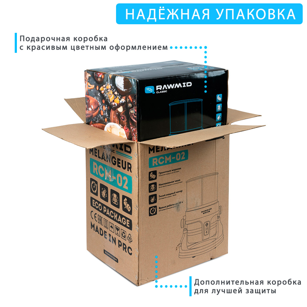 Меланжер упакован в двойную коробку. Внутренняя — подарочная, с красивым фирменным дизайном. Внешняя — обеспечивает дополнительную защиту во время перевозки.