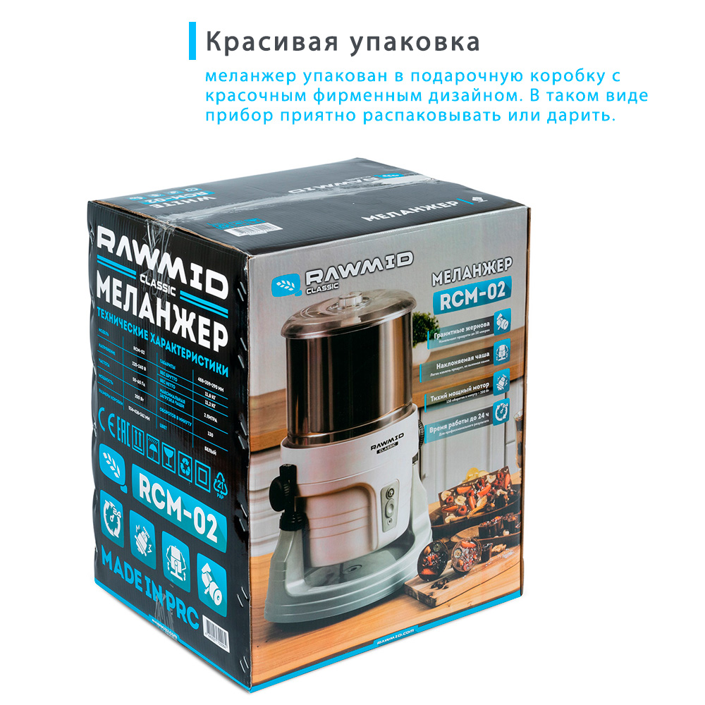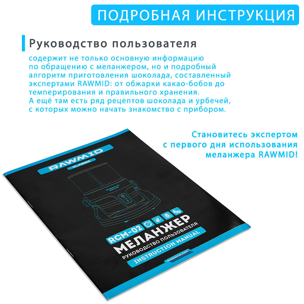 В комплект меланжера RAWMID входит подробная инструкция на русском языке. Помимо технической информации, в инструкции содержится подробный алгоритм приготовления шоколада со всеми тонкостями и нюансами, что позволит вам стать экспертом уже с первого дня использования. А ещё там есть ряд рецептов, с которых можно начать знакомство с возможностями меланжера.