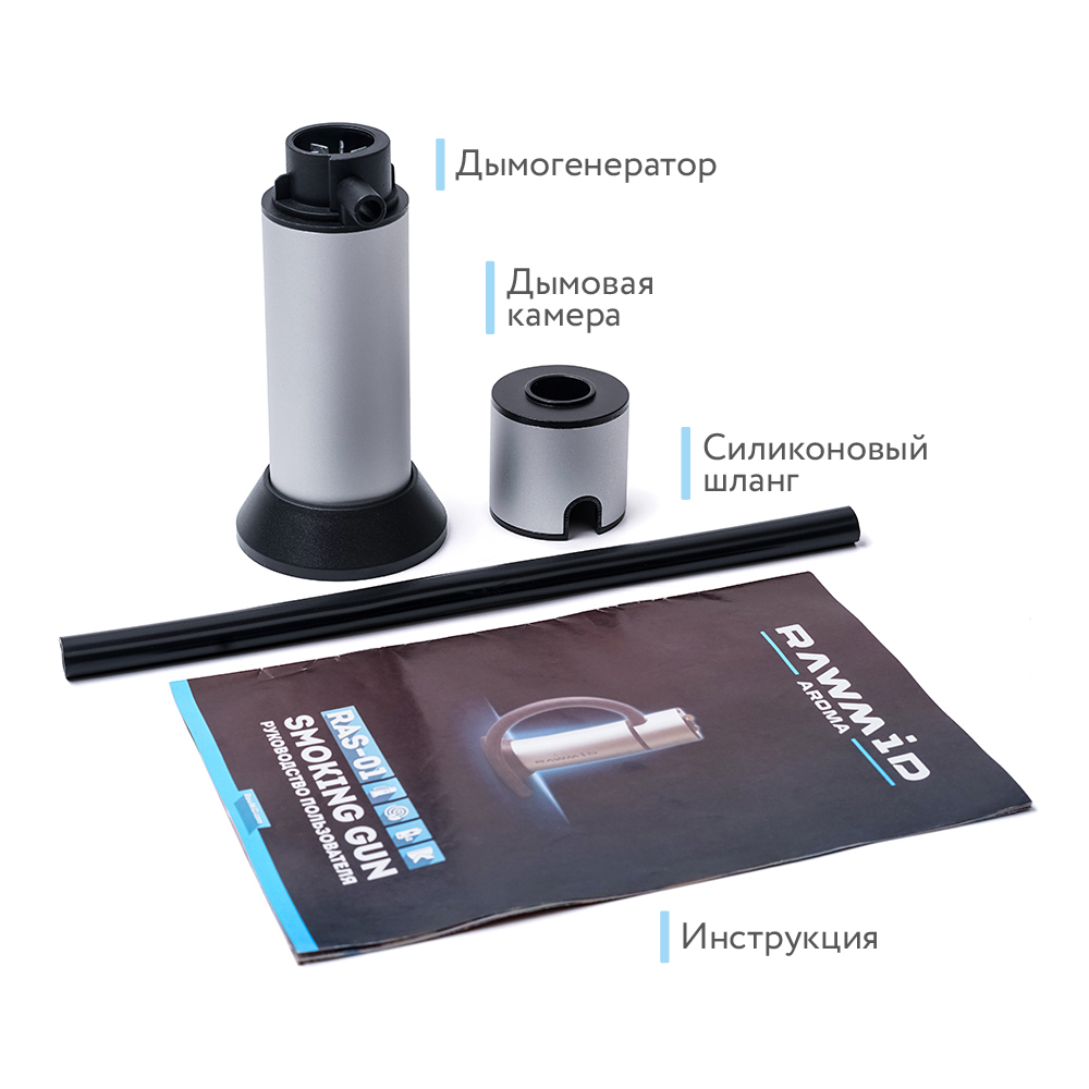 В комплект дымогенератора RAWMID RAS-01 входят: корпус прибора с отсеком для щепы, силиконовый шланг, инструкция на русском языке.