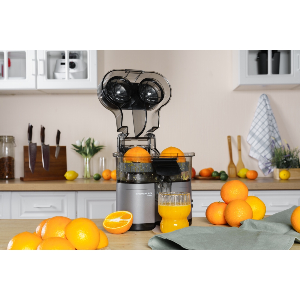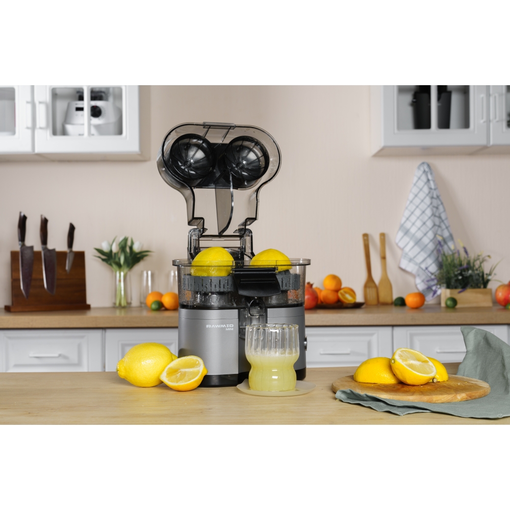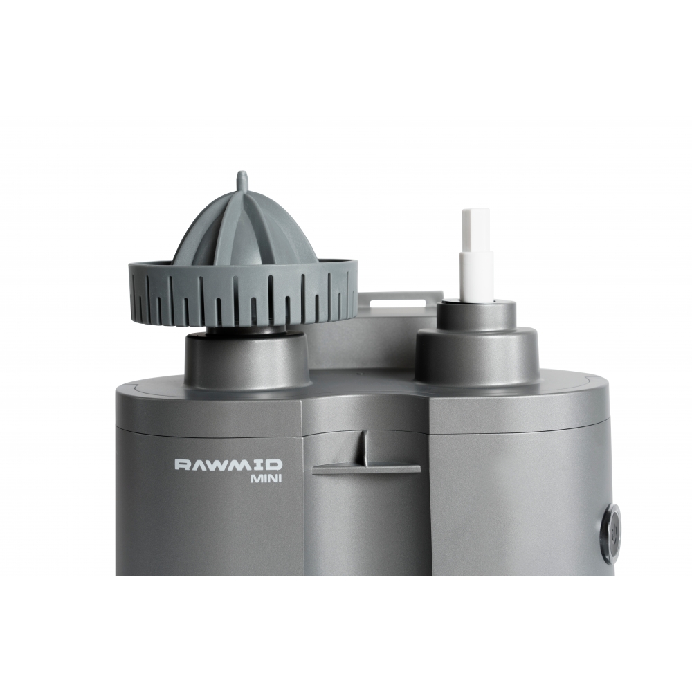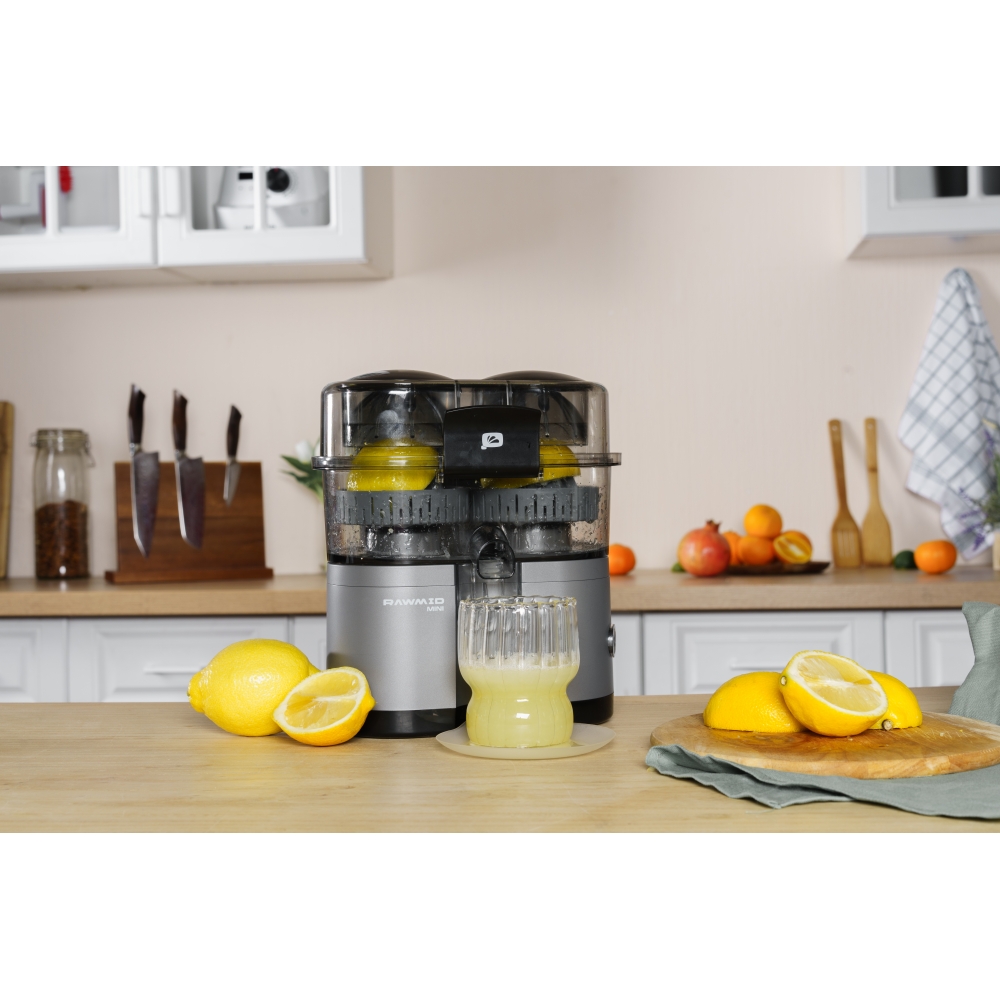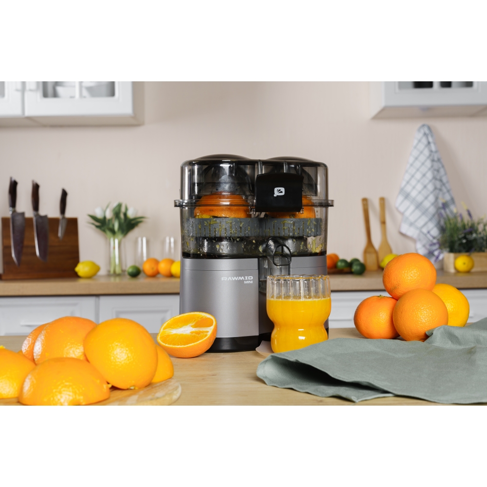 RAWMID Mini RMJ-02 — это автоматическая соковыжималка для цитрусовых нового поколения, которая делает процесс приготовления свежевыжатого сока невероятно простым, быстрым и гигиеничным. Благодаря уникальной конструкции с двойным конусом и встроенным ножом-резаком, аппарат полностью автоматизирует цикл отрезания и отжима — никаких ножей, досок и необходимости удерживать фрукт руками!