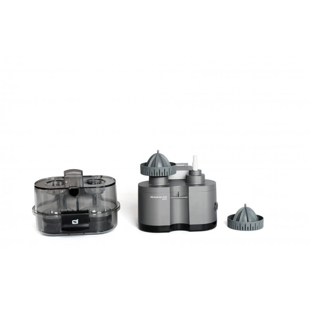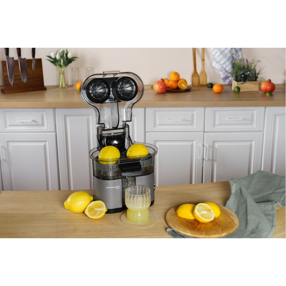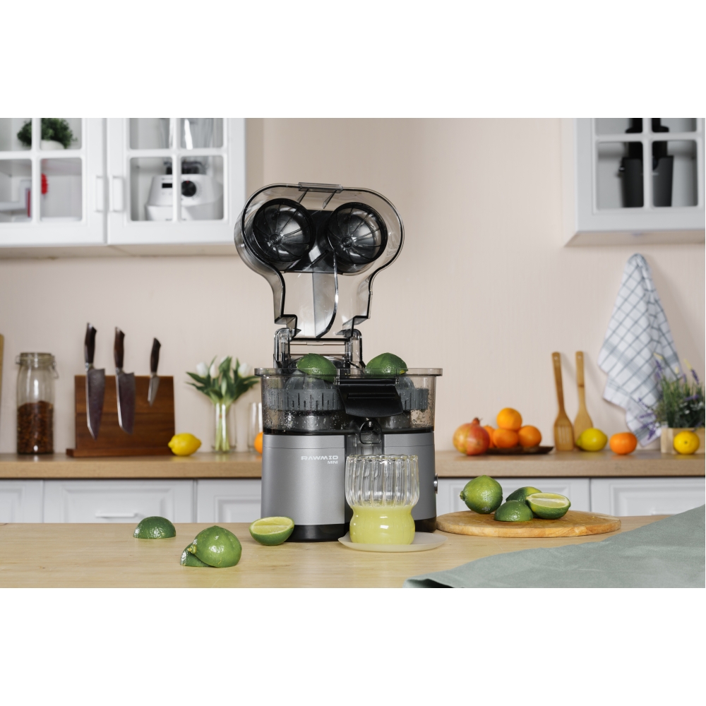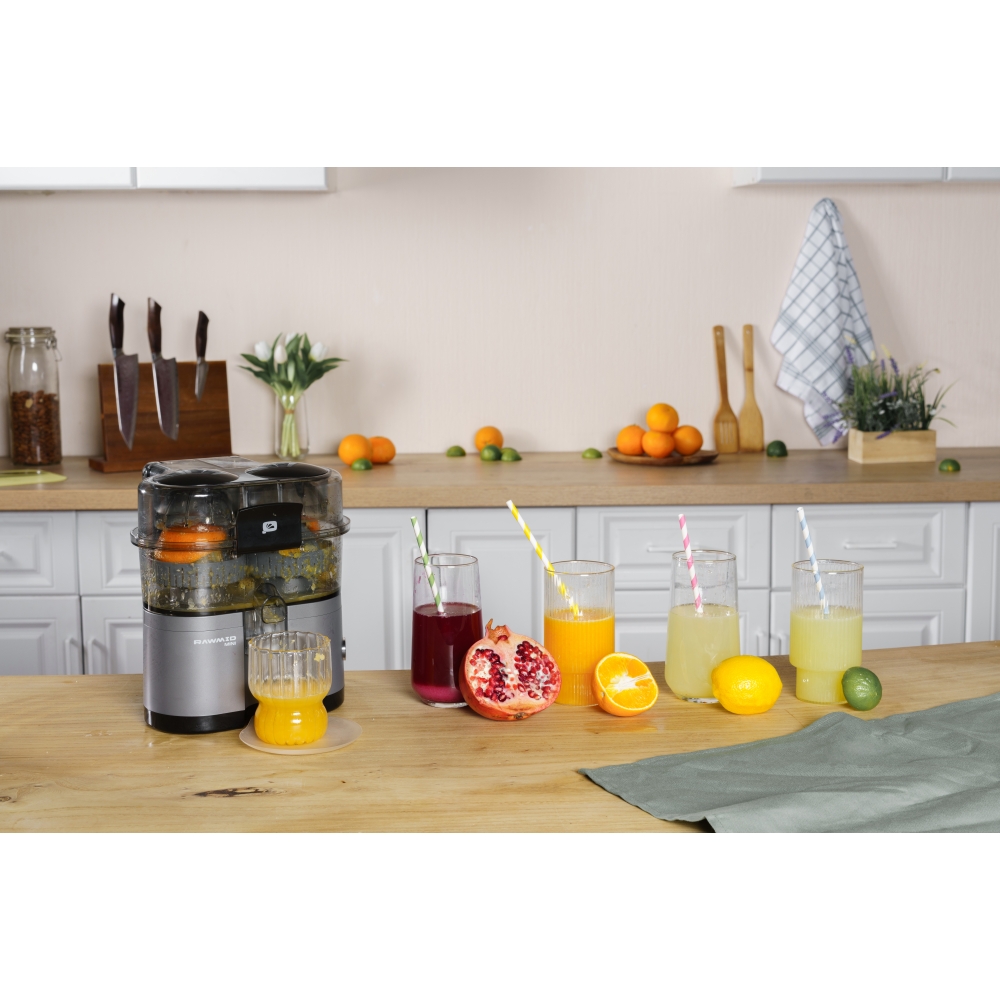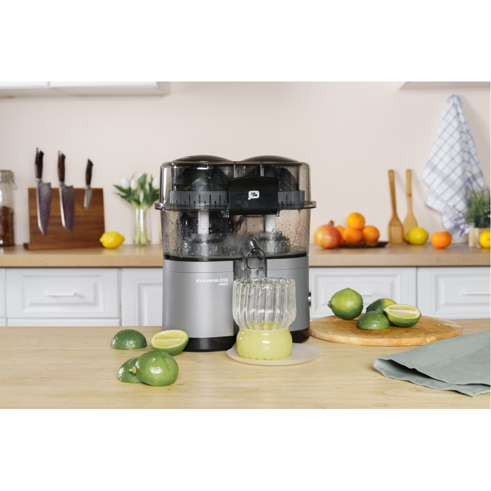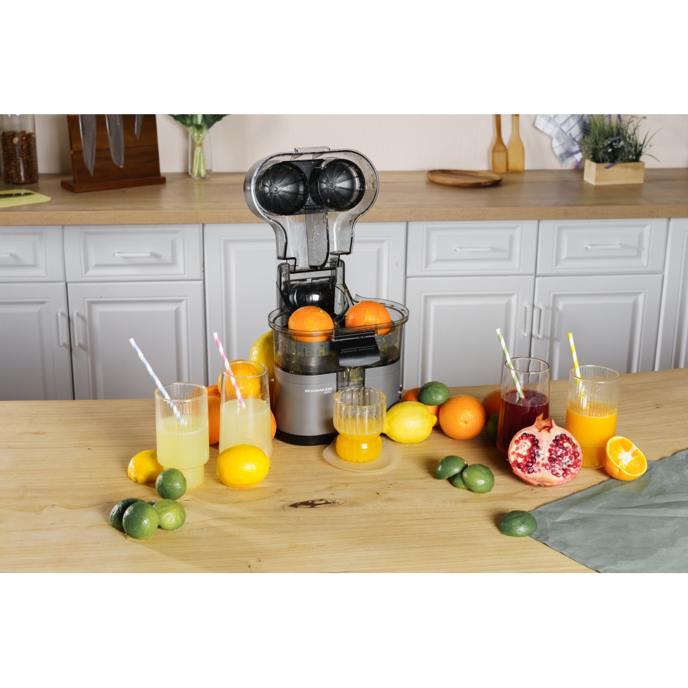 RAWMID Mini RMJ-02 — это автоматическая соковыжималка для цитрусовых нового поколения, которая делает процесс приготовления свежевыжатого сока невероятно простым, быстрым и гигиеничным. Благодаря уникальной конструкции с двойным конусом и встроенным ножом-резаком, аппарат полностью автоматизирует цикл отрезания и отжима — никаких ножей, досок и необходимости удерживать фрукт руками!