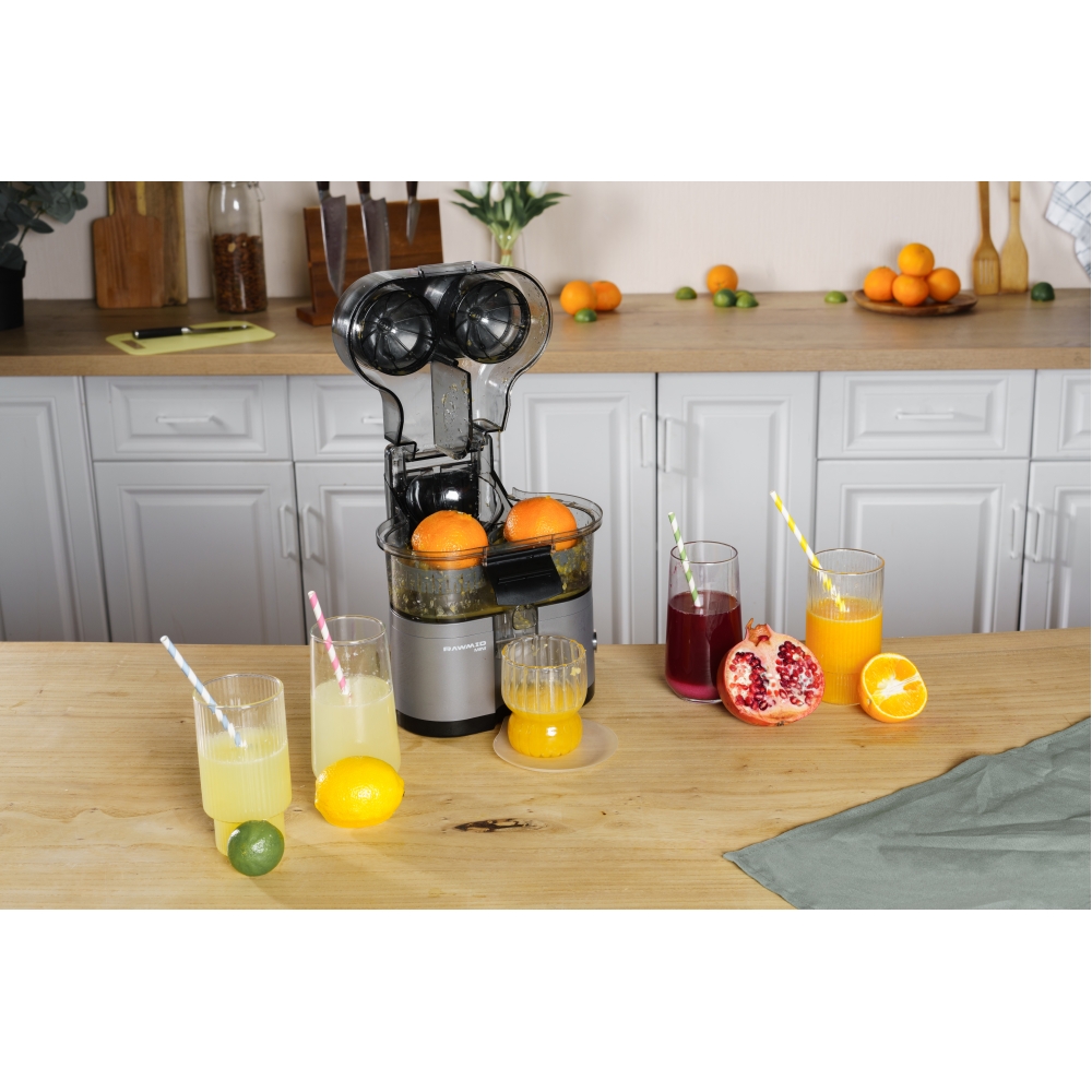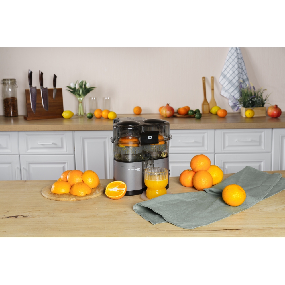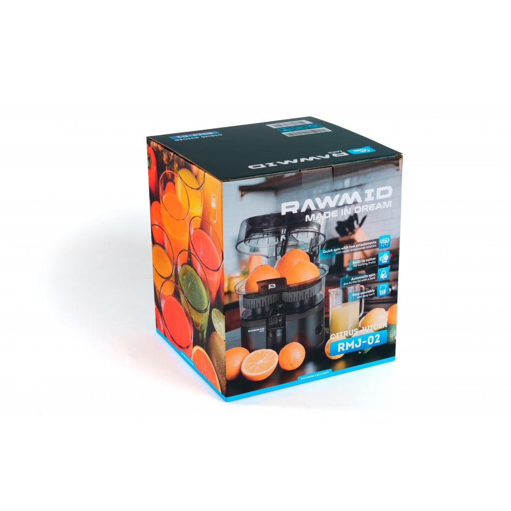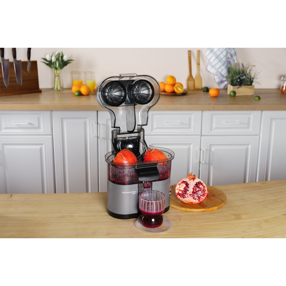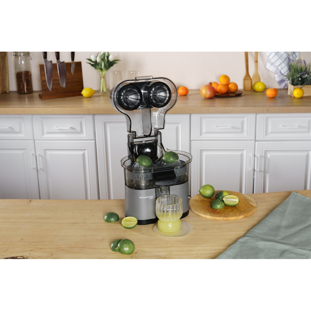 RAWMID Mini RMJ-02 — это автоматическая соковыжималка для цитрусовых нового поколения, которая делает процесс приготовления свежевыжатого сока невероятно простым, быстрым и гигиеничным. Благодаря уникальной конструкции с двойным конусом и встроенным ножом-резаком, аппарат полностью автоматизирует цикл отрезания и отжима — никаких ножей, досок и необходимости удерживать фрукт руками!