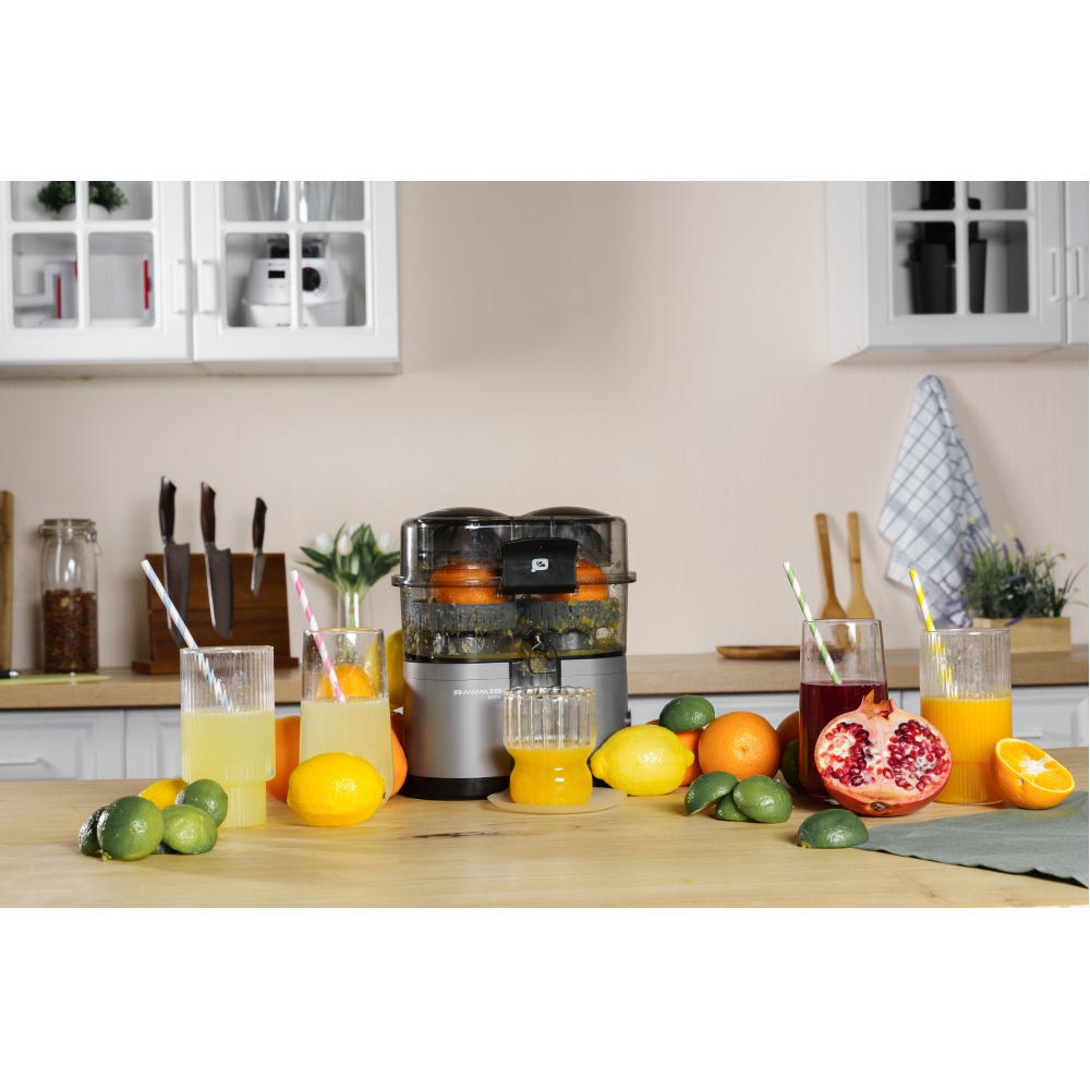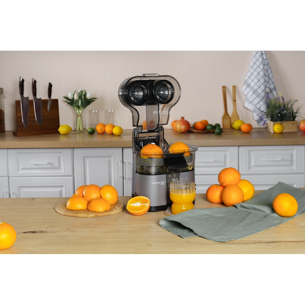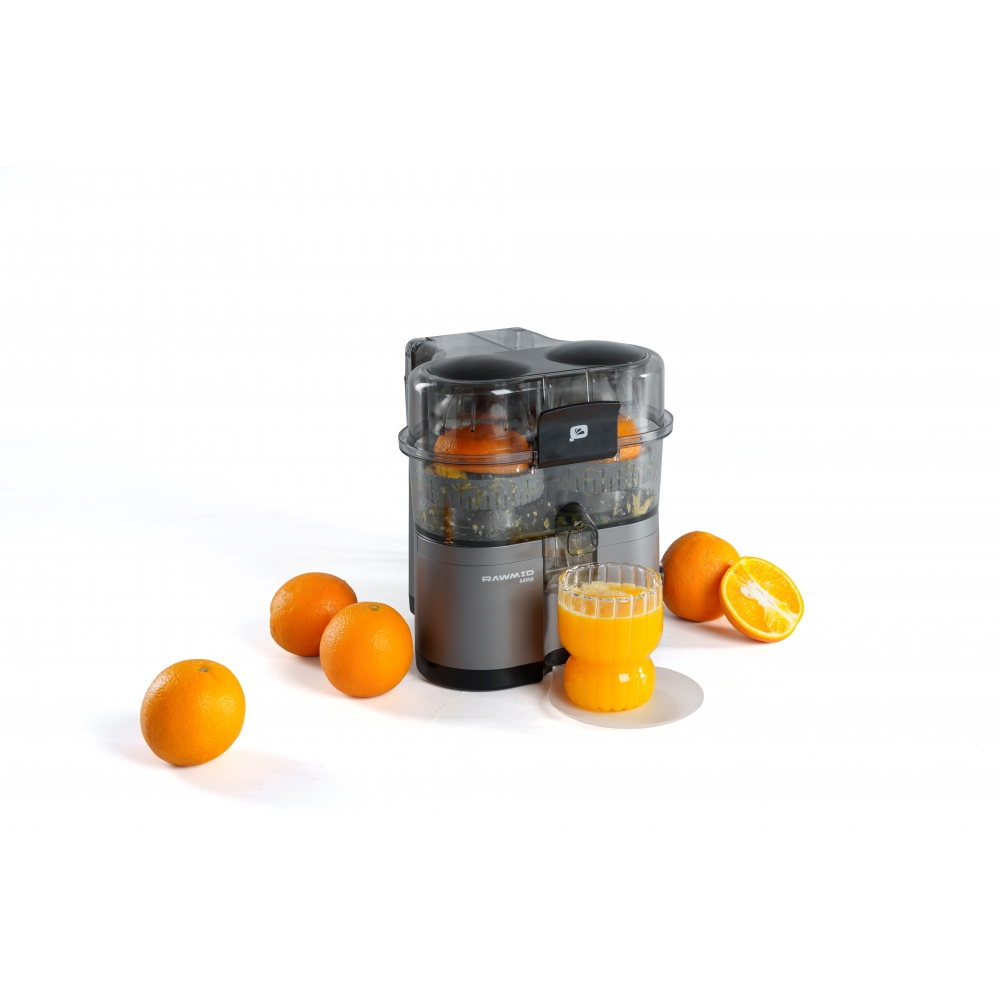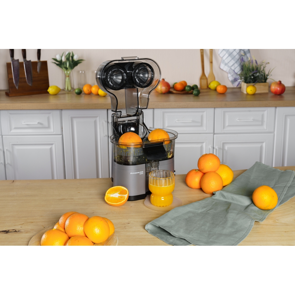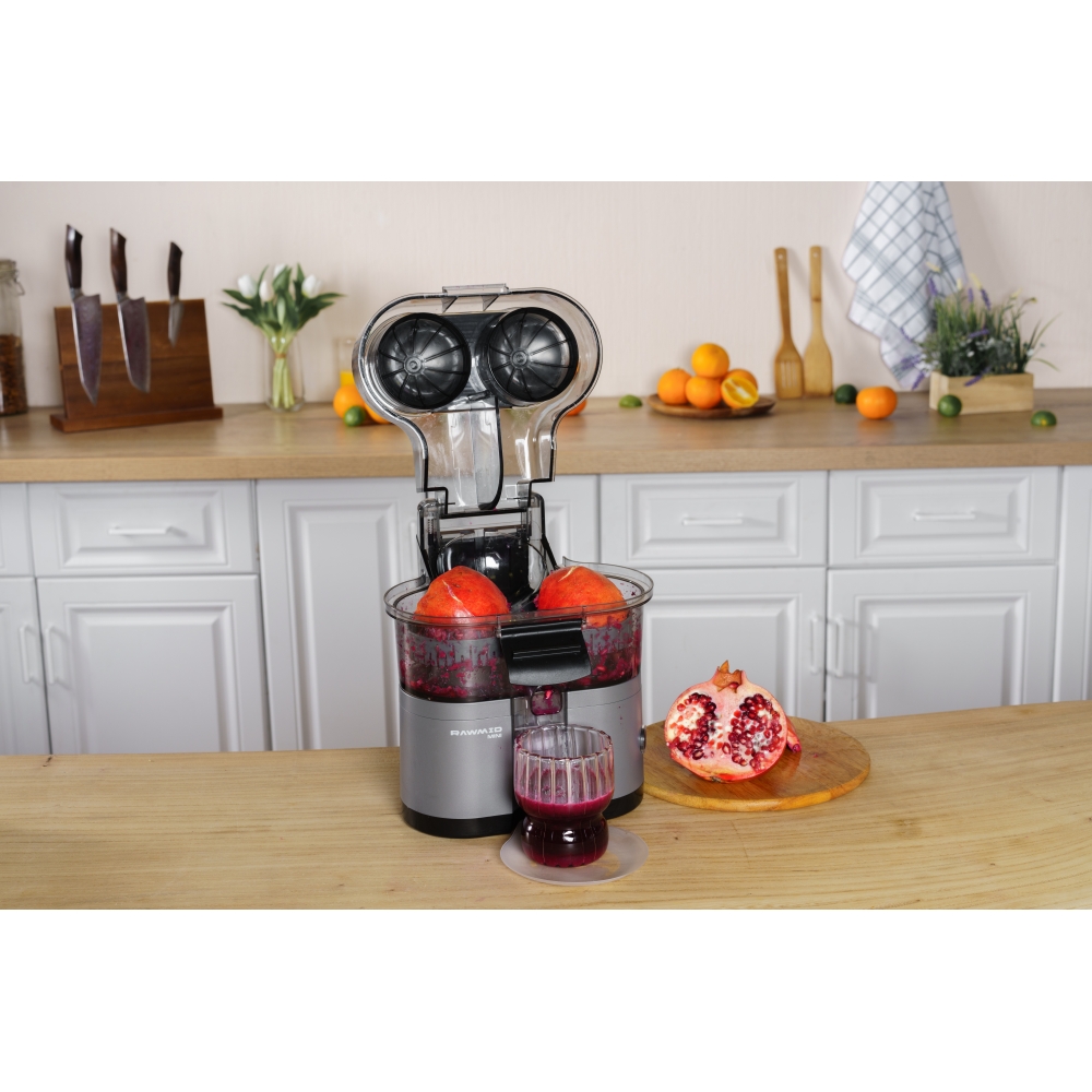 RAWMID Mini RMJ-02 — это автоматическая соковыжималка для цитрусовых нового поколения, которая делает процесс приготовления свежевыжатого сока невероятно простым, быстрым и гигиеничным. Благодаря уникальной конструкции с двойным конусом и встроенным ножом-резаком, аппарат полностью автоматизирует цикл отрезания и отжима — никаких ножей, досок и необходимости удерживать фрукт руками!