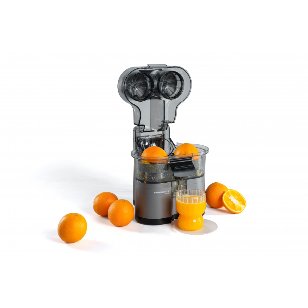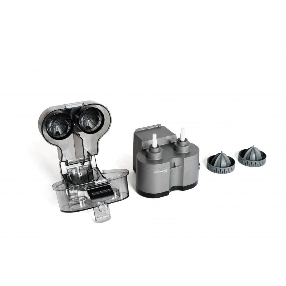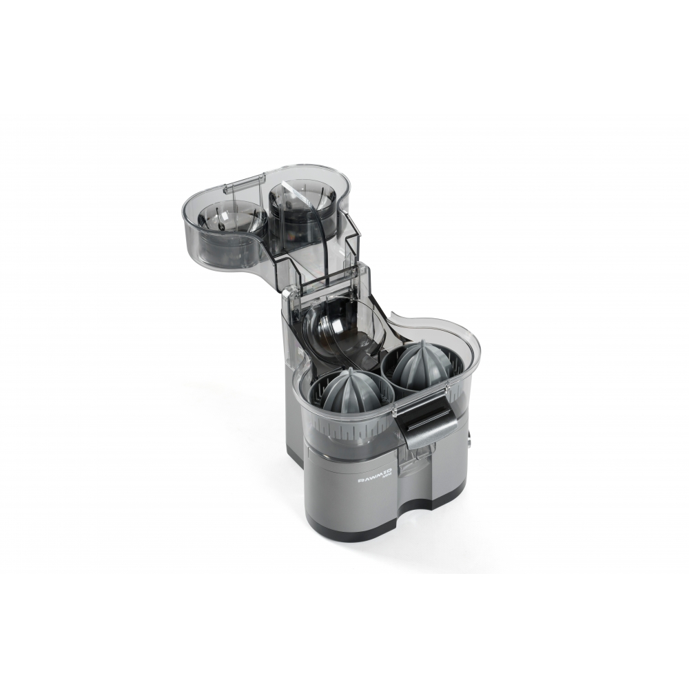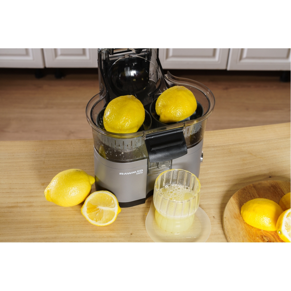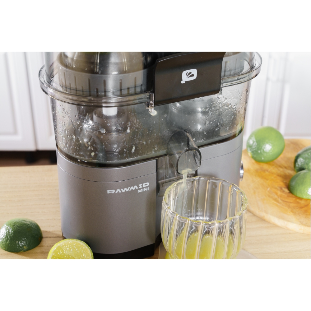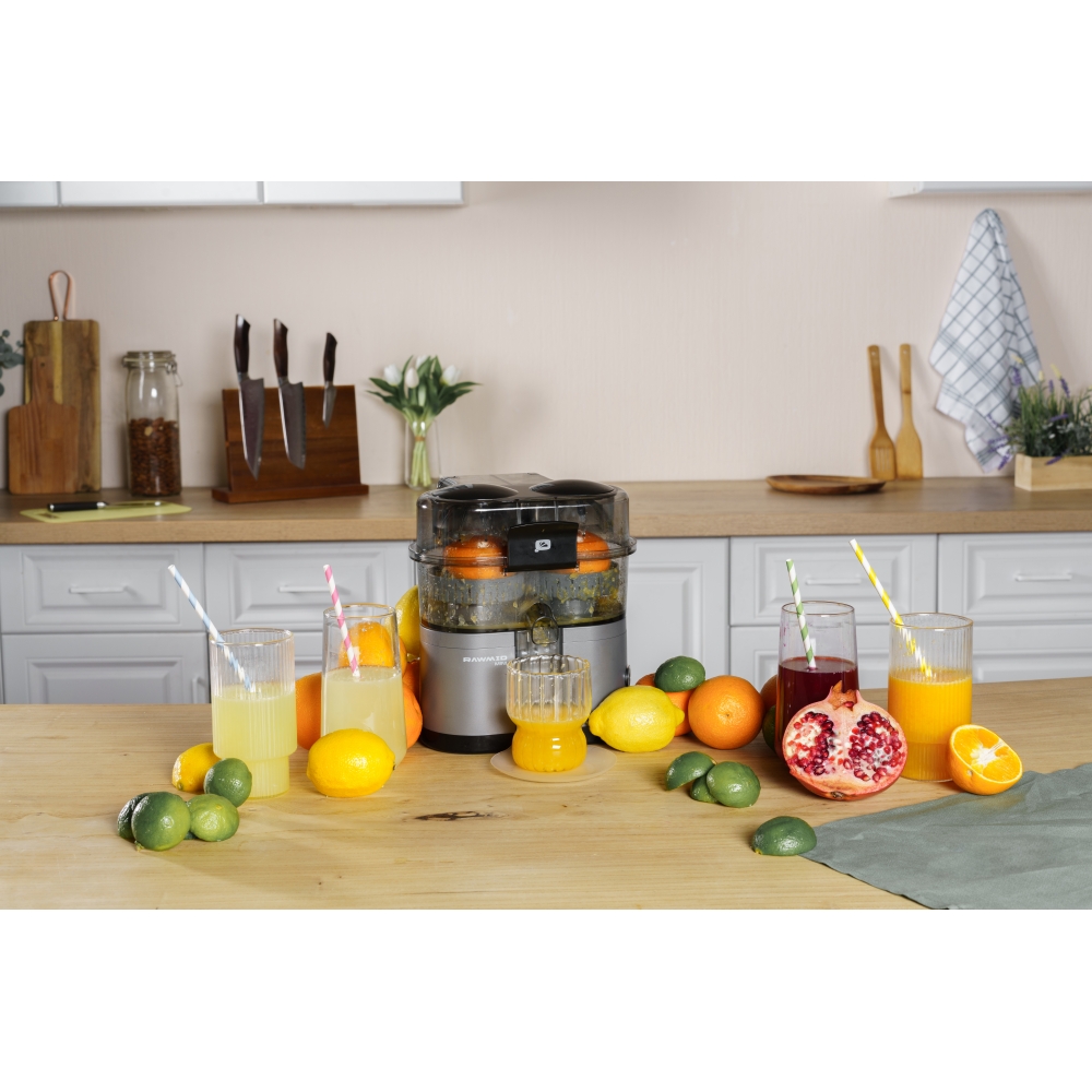 RAWMID Mini RMJ-02 — это автоматическая соковыжималка для цитрусовых нового поколения, которая делает процесс приготовления свежевыжатого сока невероятно простым, быстрым и гигиеничным. Благодаря уникальной конструкции с двойным конусом и встроенным ножом-резаком, аппарат полностью автоматизирует цикл отрезания и отжима — никаких ножей, досок и необходимости удерживать фрукт руками!