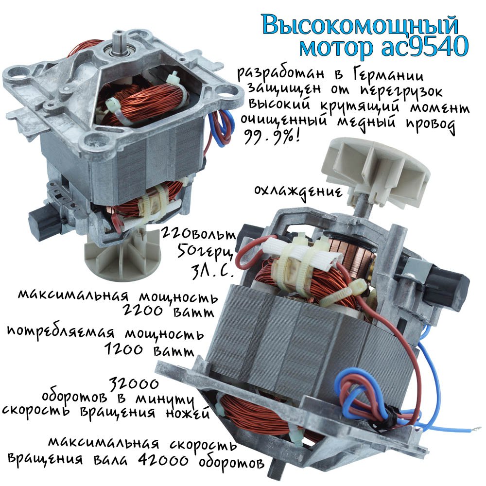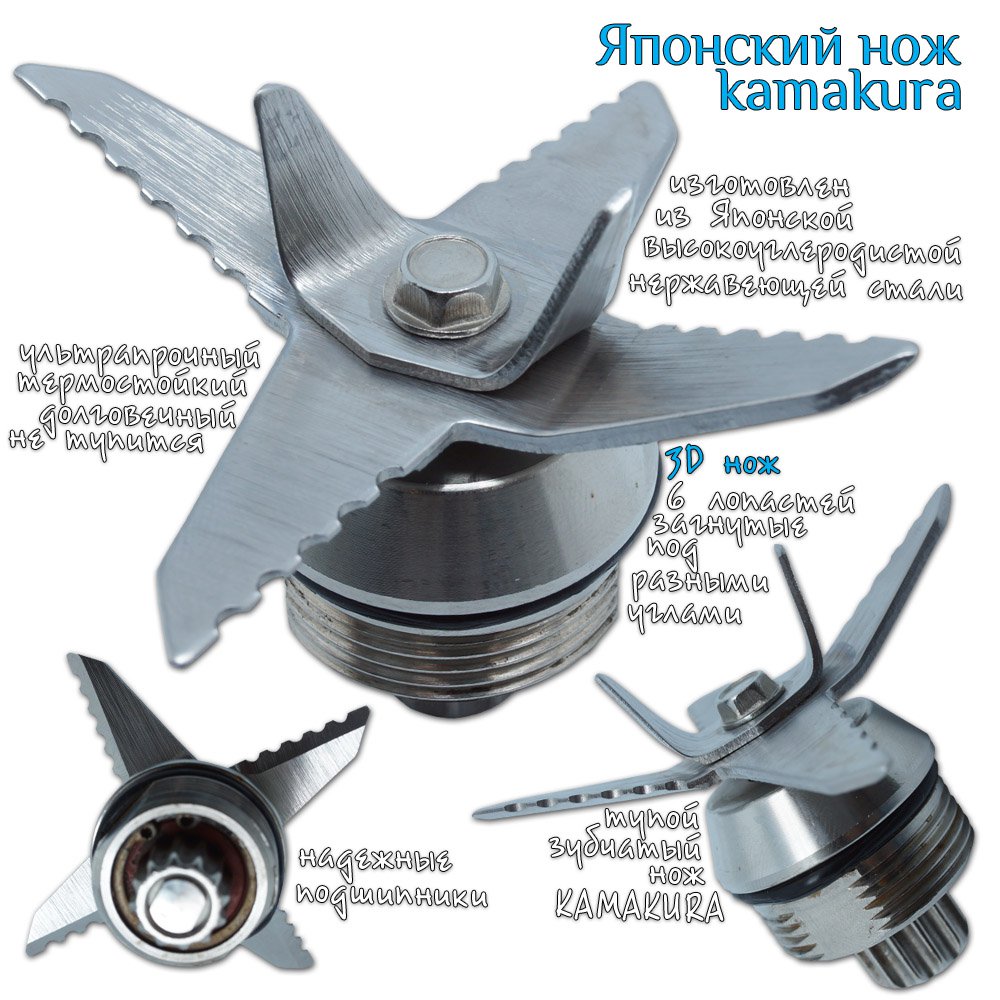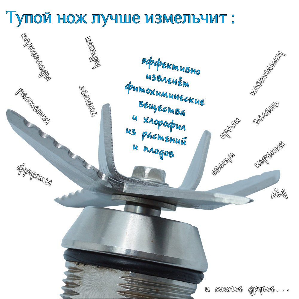 Мощность мотора блендера составляет 1200 Ватт (3 ЛС), а количество оборотов ножа в минуту составляет 32 000. Нож из прочнейшей нержавеющей высокоуглеродистой стали, имеющей по 6 зубцов на каждой лопасти родом из Японии способны измельчать любые продукты. Был испытан на брусках из дерева которые измельчились в опилки, без каких либо проблем (в домашних условиях так делать не советуем). Кроме того эти лезвия не окисляют продукты, но к тому же способствуют высвобождению более 90% фитонутриентов!