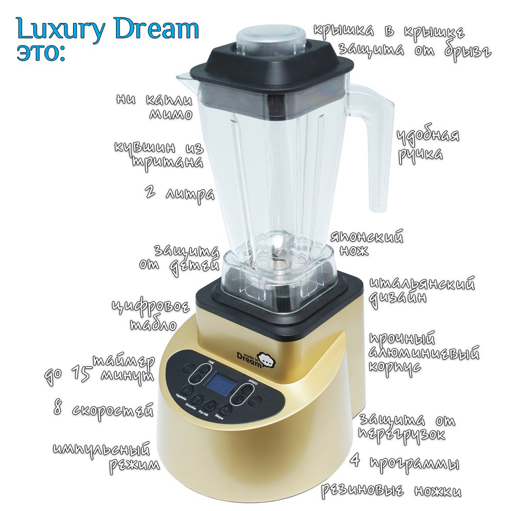 Чем отличается профессиональный блендер от обычного и почему нужно купить именно Luxury Dream? Во-первых, он дает больше возможностей, экономит время по сравнению с традиционными приборами, а во-вторых, Luxury Dream: