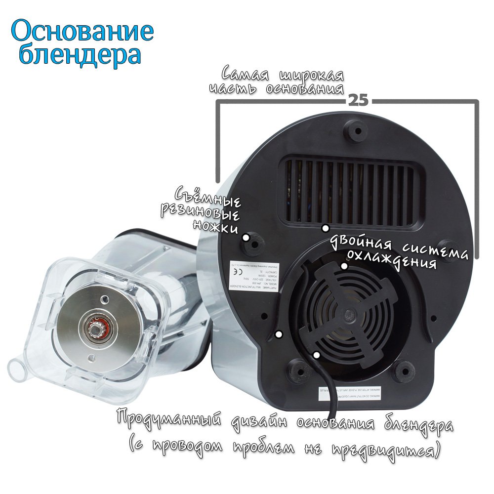 Кроме того блендер оснащён защитой от перегрева, что способствует отключению блендера на некоторое время до охлаждения мотора - это сделано для  того чтобы мотор служил долго и не сгорел перегревшись, при перепадах напряжения.