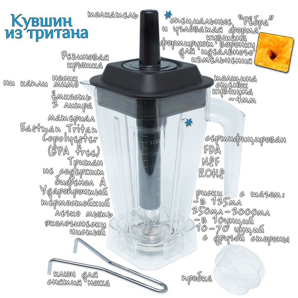 Чаша блендера изготовлена из высокопрочного пластика именуемого Тританом.