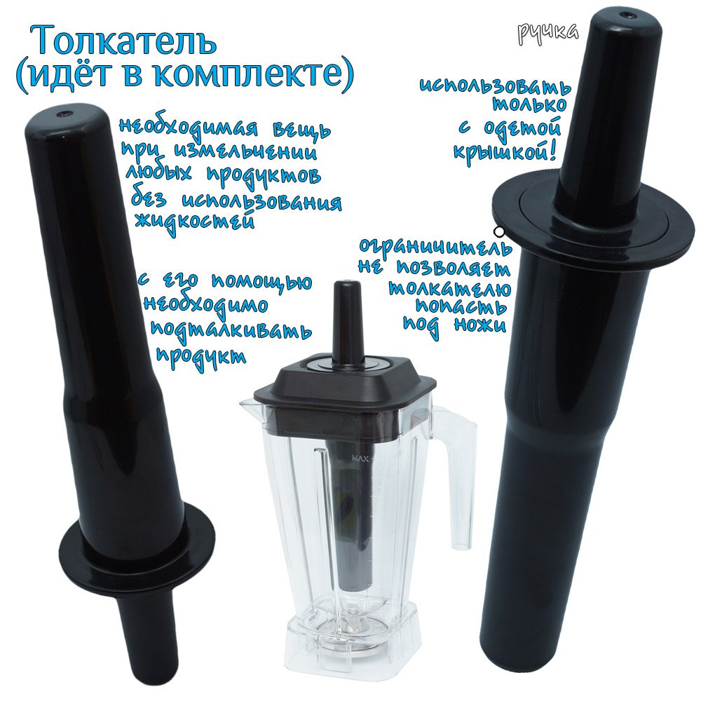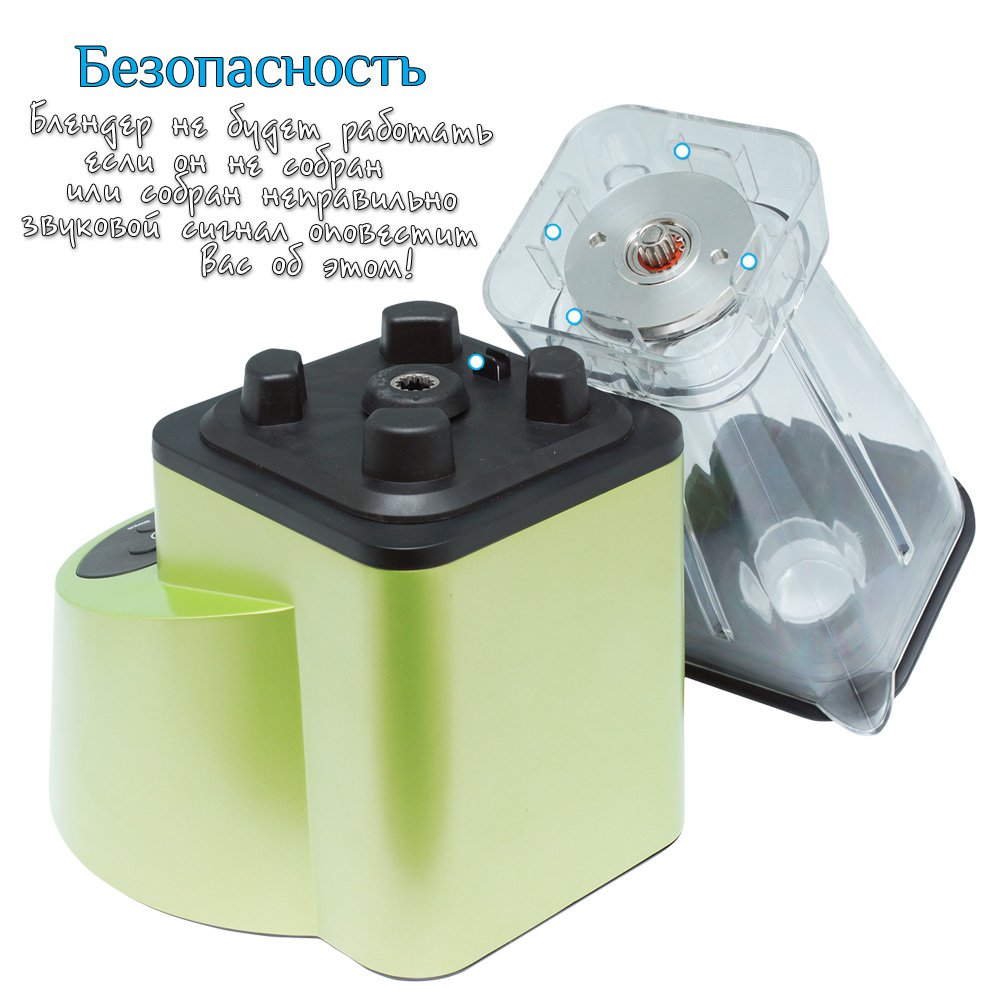 Имеется ещё так называемая "защита от детей" - то есть на верхней части корпуса блендера располагается специальная кнопка которая блокирует работу блендера без установленной поверх чаши, при снятии чаши блендер так же отключается. Стоит отметить, что данный механизм не является каким то маркетинговым ходом, так как показывает наш опыт многие пользователи блендеров не имеющих такую защиту часто извлекают чашу не дождавшись остановки мотора и тем самым повреждают "грибообразную" фиксирующую кувшин часть на блендер и её приходится менять, конечно все детали можно приобрести у нас, но это стоит денег.