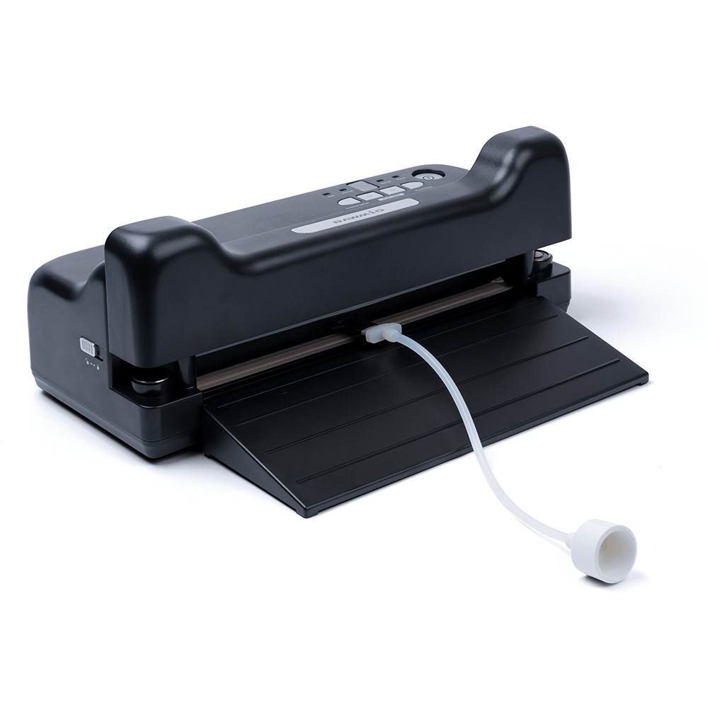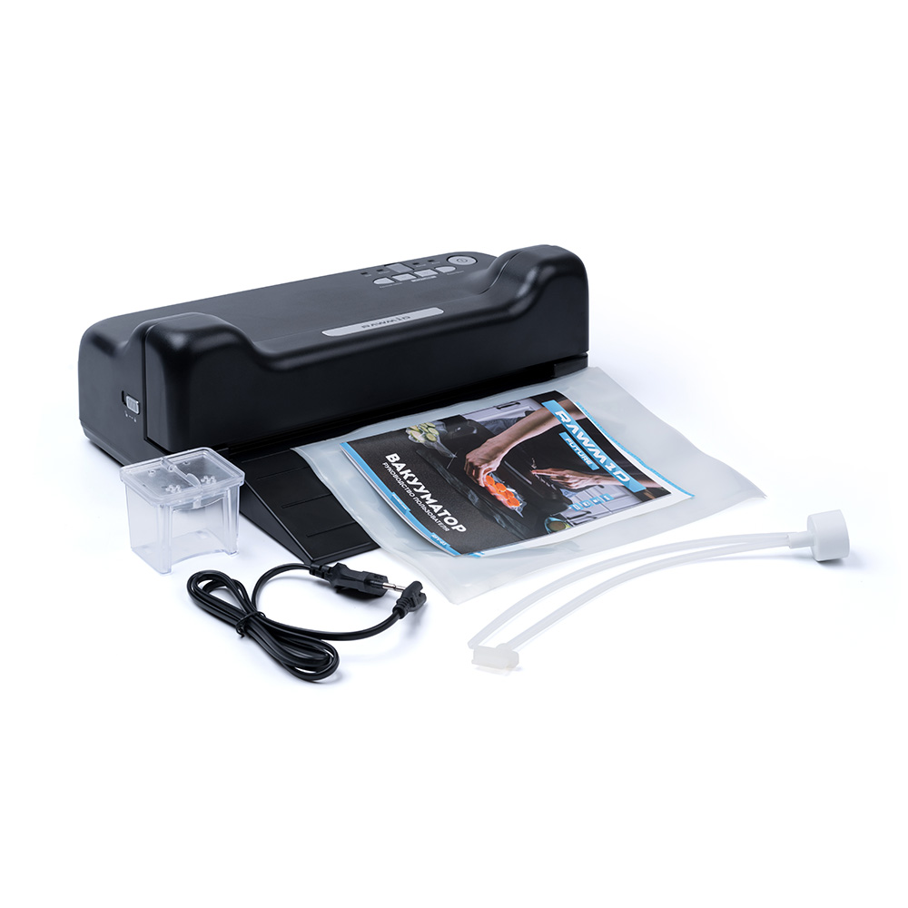 Модель RAWMID RFV-03 умеет запаивать пакеты и откачивать из них воздух. Также устройство работает с бутылками и контейнерами, откачивая воздух из тары посредством шланга.