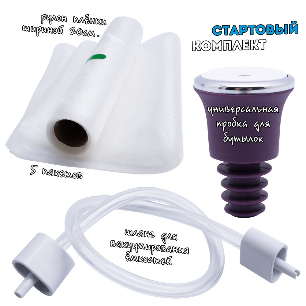 5. Приятно укомплектован. В коробке рулон упаковочной пленки (ширина 20 см), пакеты 5 шт (20х30 см), шланг для откачивания воздуха, а также специальная пробка для вакуумирования бутылок. Наклейки-глаза и наклейка-логотип помогут по настроению оформить свой новый кухонный прибор. Инструкция на русском языке прилагается.