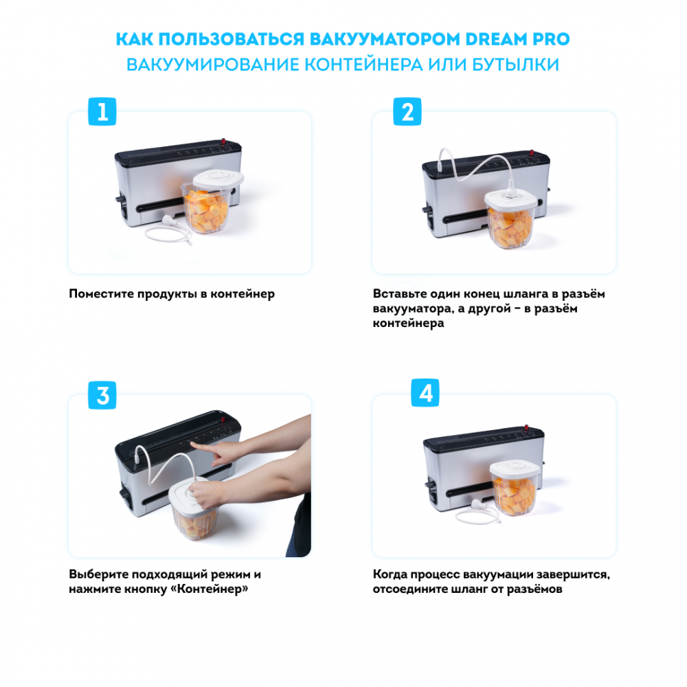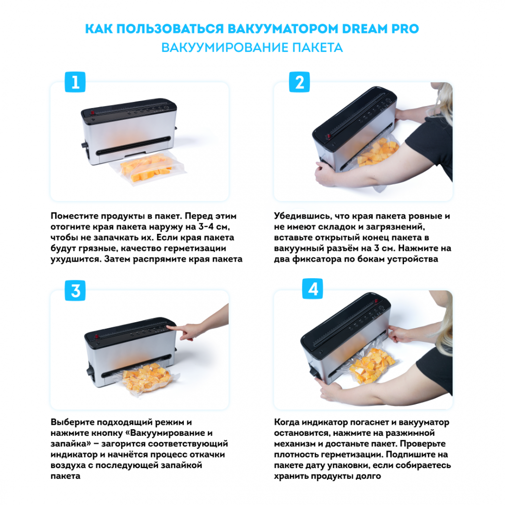 В комплект вакууматора входит подробная инструкция на русском языке с картинками, благодаря чему использование прибора не составит труда даже тем, кто с техникой на «вы».