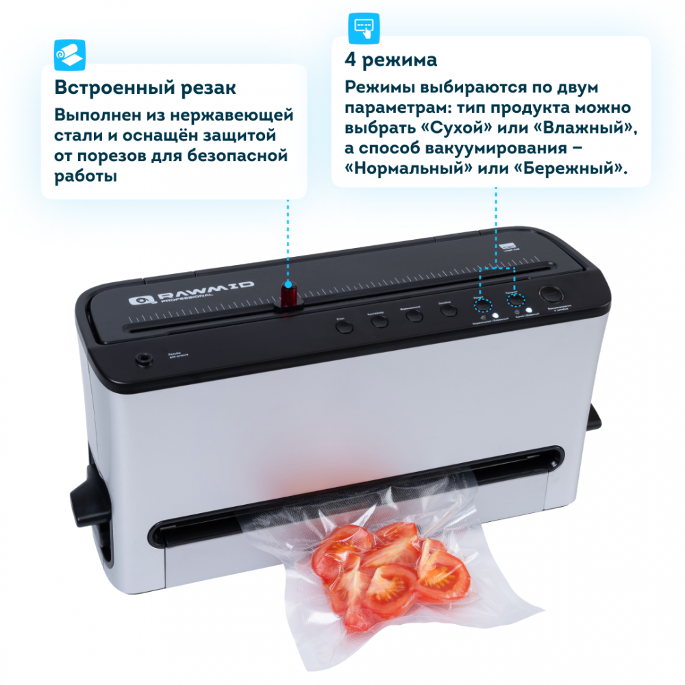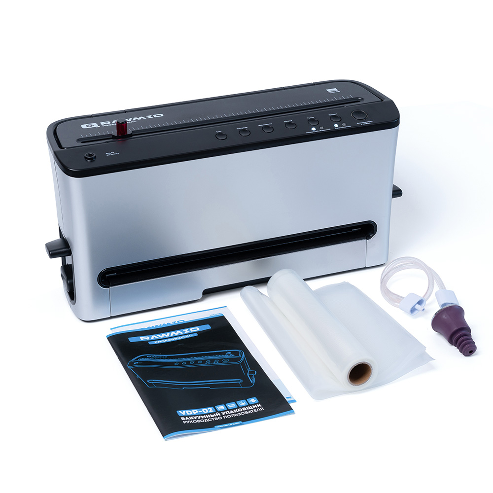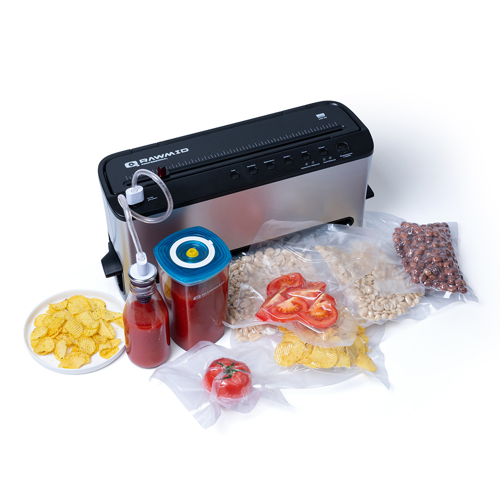 Вакууматор RAWMID Dream PRO VDP-02 – это универсальный и многофункциональный прибор, позволяющий вакуумировать продукты в любой упаковке: контейнерах, бутылках и рифлёных пакетах, многократно продлевая их срок хранения. Благодаря наличию специальных режимов, прибор прекрасно подходит для вакуумирования сухих, влажных и деликатных продуктов. А встроенный отсек для хранения плёночного рулона и встроенный резак для плёнки повышают удобство использования.
