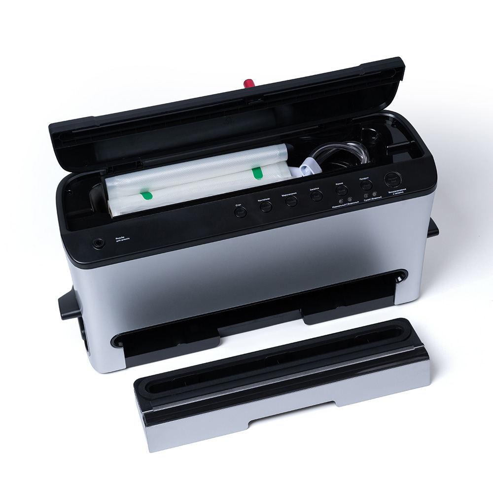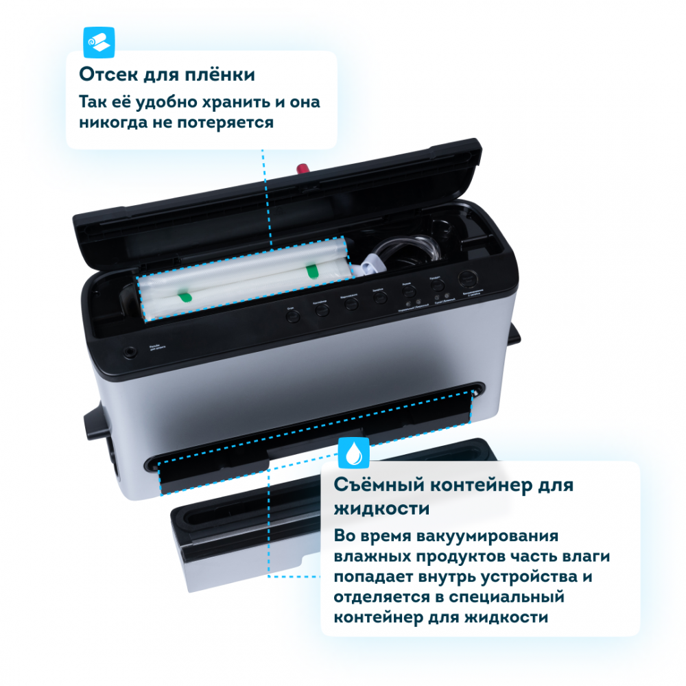 Во время вакуумирования влажных продуктов часть влаги попадает внутрь устройства и отделяется в специальный контейнер для жидкости, за счёт чего прибор надёжно работает с данным типом продуктов. Когда контейнер заполняется, он легко вынимается и опустошается.