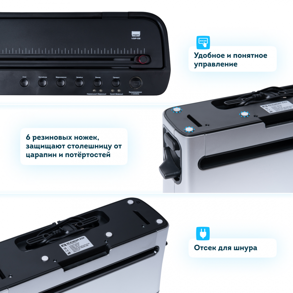 В нижней части корпуса имеется специальное отделение для шнура питания, благодаря чему повышается удобство хранения и использования вакууматора.