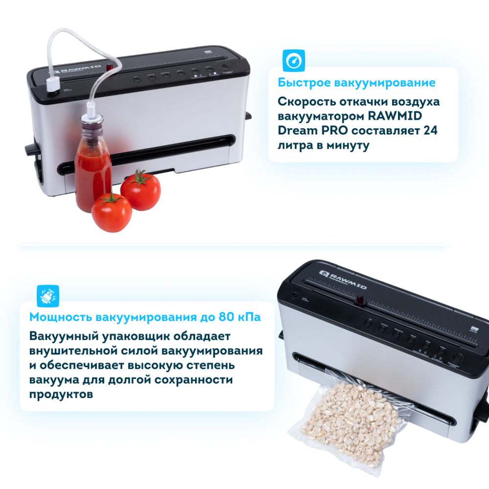 Благодарим за положительный отзыв и выбор вакууматора RAWMID Dream Pro VDP-02! Рады, что техника работает превосходно. Желаем приятного и комфортного использования. С уважением, команда RAWMID.
