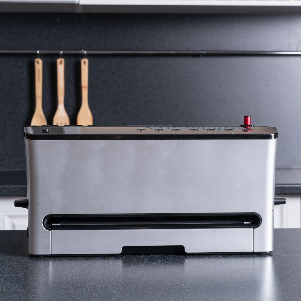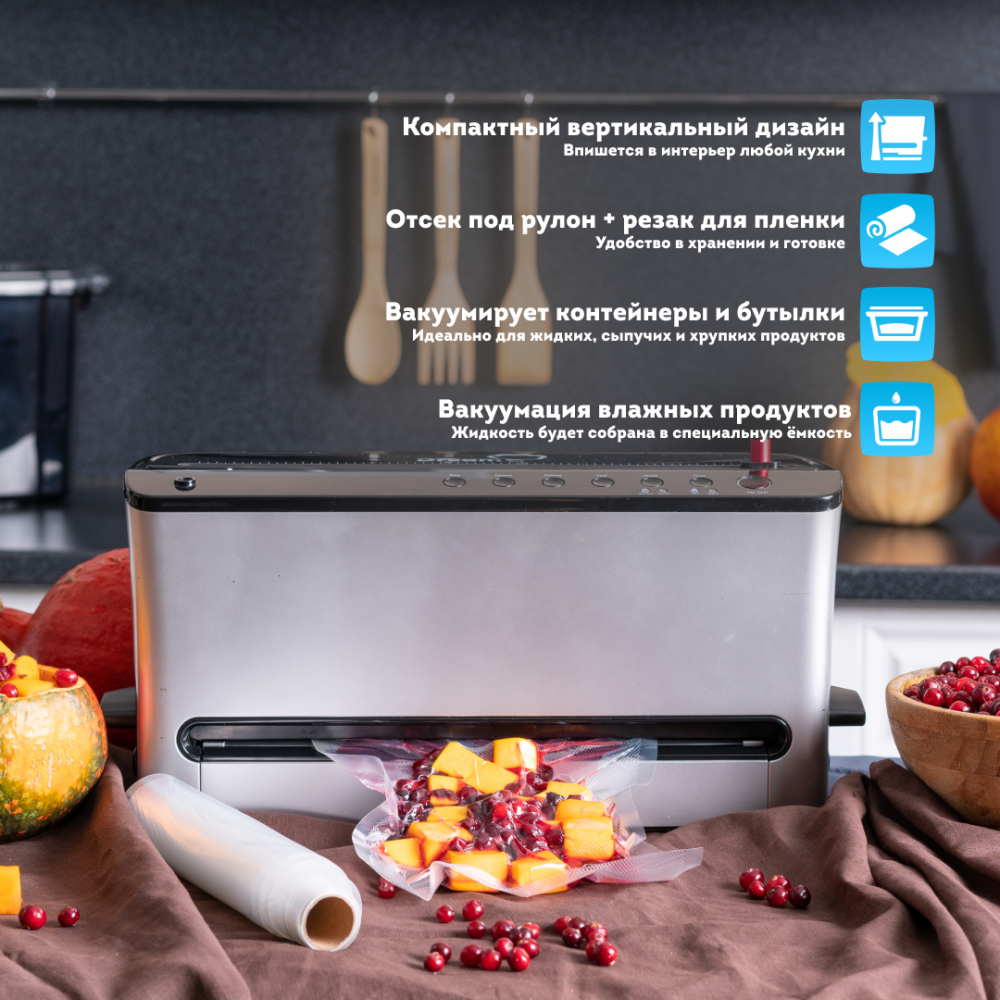 Размеры вакууматора составляют всего 40×19×13 см (Д×В×Г). Благодаря вертикальному корпусу, прибор занимает совсем мало места на столе и позволяет комфортно работать даже с большим количеством продуктов.