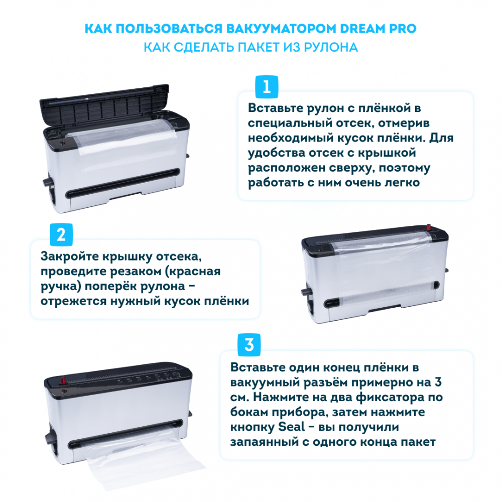 Dream Pro может делать свою работу не только в домашних условиях, но и в производстве. Встроенный резак, отсек для рулона и возможность вакуумировать контейнера. Читать полностью