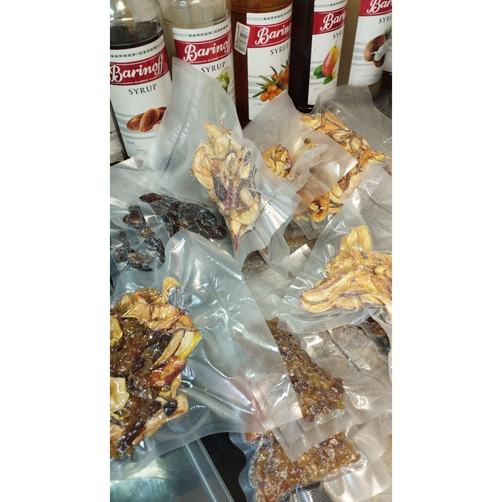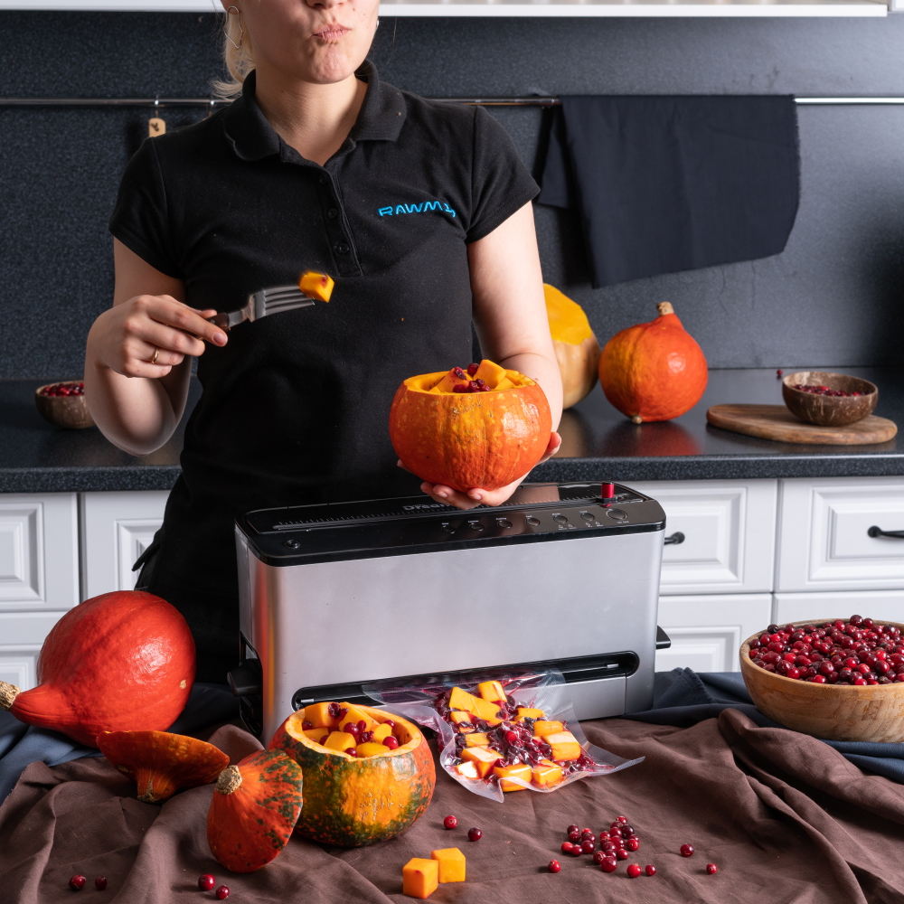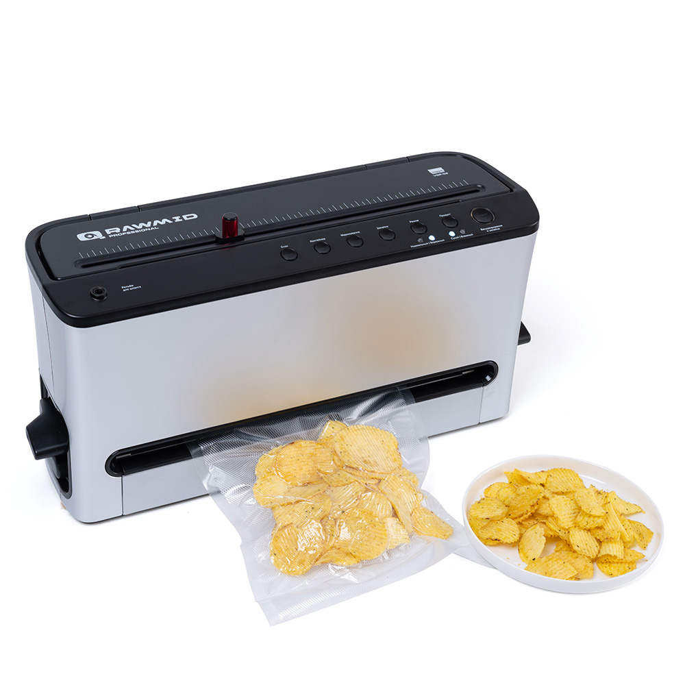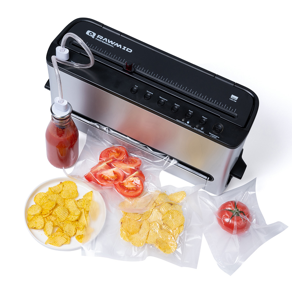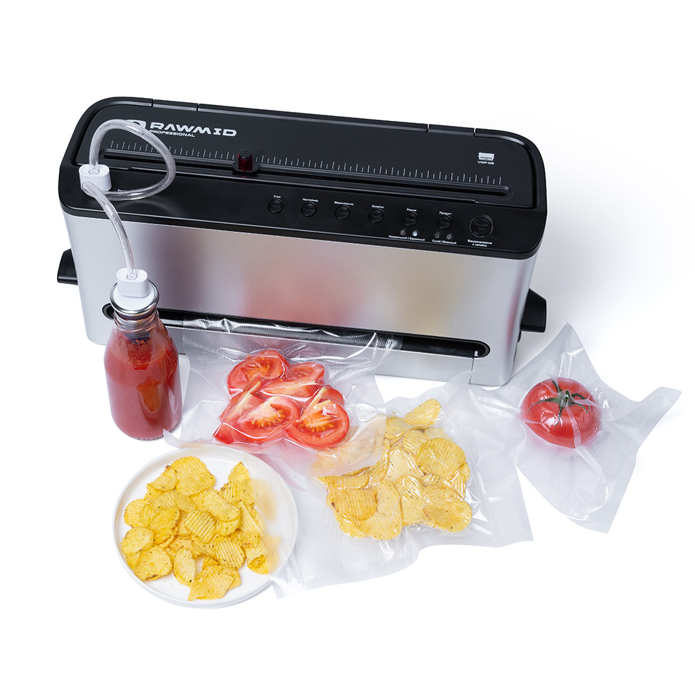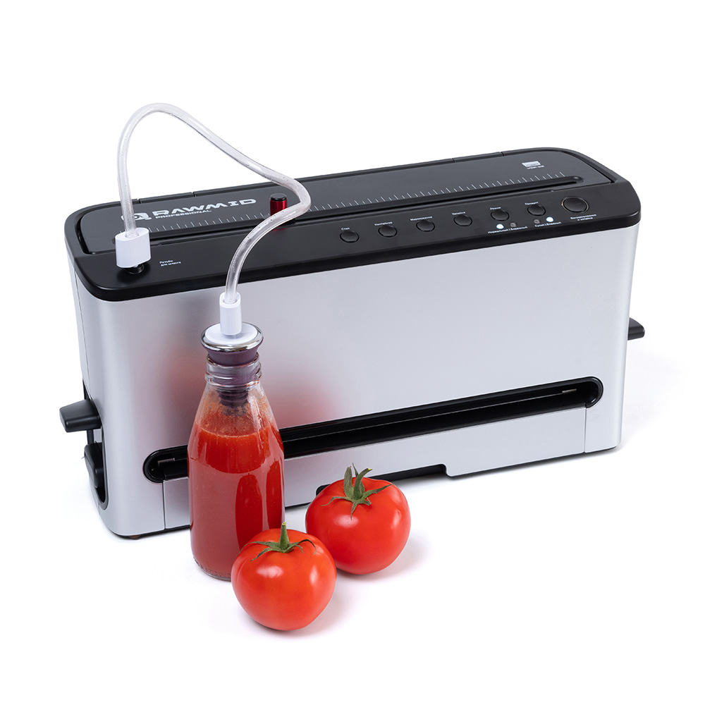 Благодаря наличию специального предусмотренного режима, вакуумный упаковщик RAWMID Dream PRO прекрасно подходит для вакуумирования жидкостей и влагосодержащих сочных продуктов, например, нарезанных овощей и фруктов, сочных стейков, соков, смузи, супов.