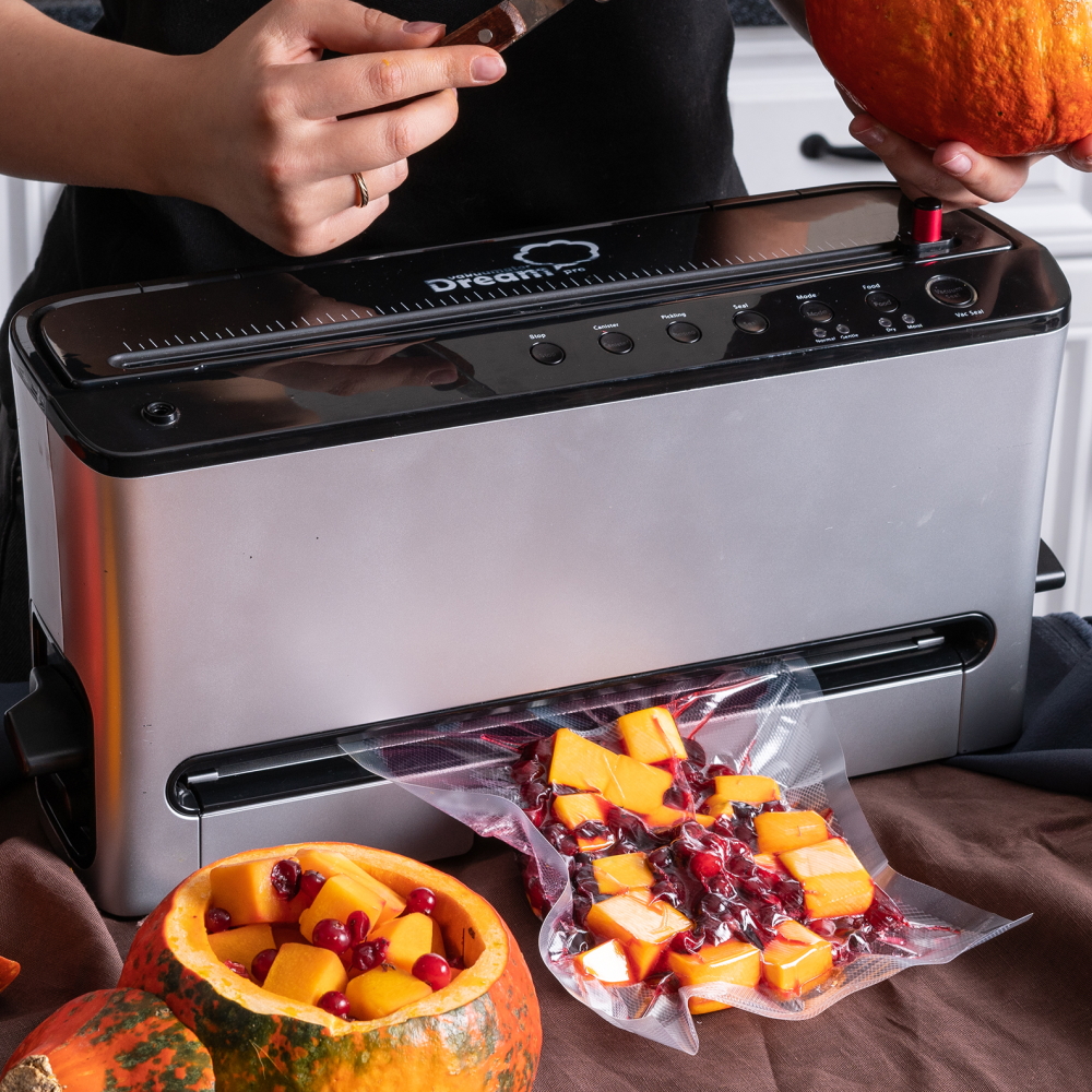 Вакууматор Dream PRO позволяет не только удобно хранить плёнку, но и нарезать её на куски нужного размера, чтобы делать пакеты. Встроенный резак выполнен из нержавеющей стали и оснащён защитой от порезов для безопасной работы.
